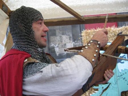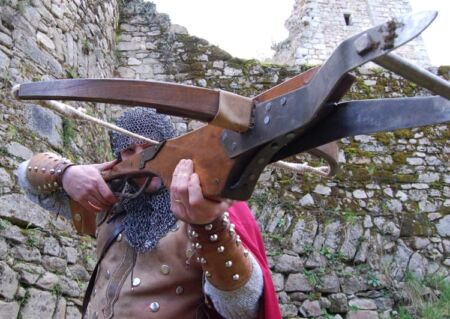 Il présente l’arbalète à tours, communément appelée « baliste », arme de siège, de 1,20 mètre x 1,20 mètre (avec le socle) et 1,80 mètre de hauteur.
